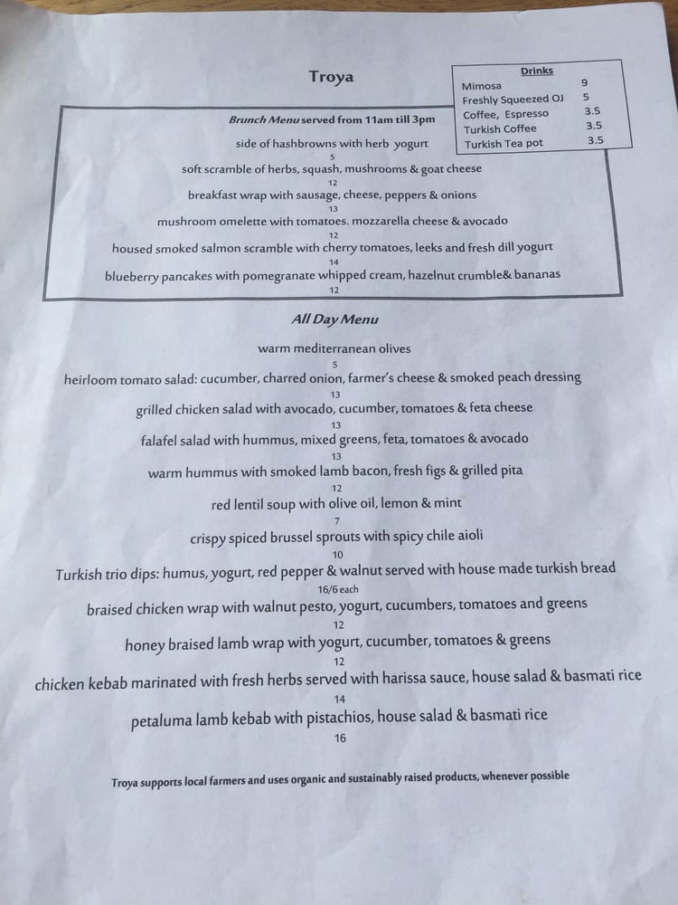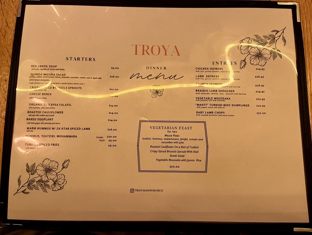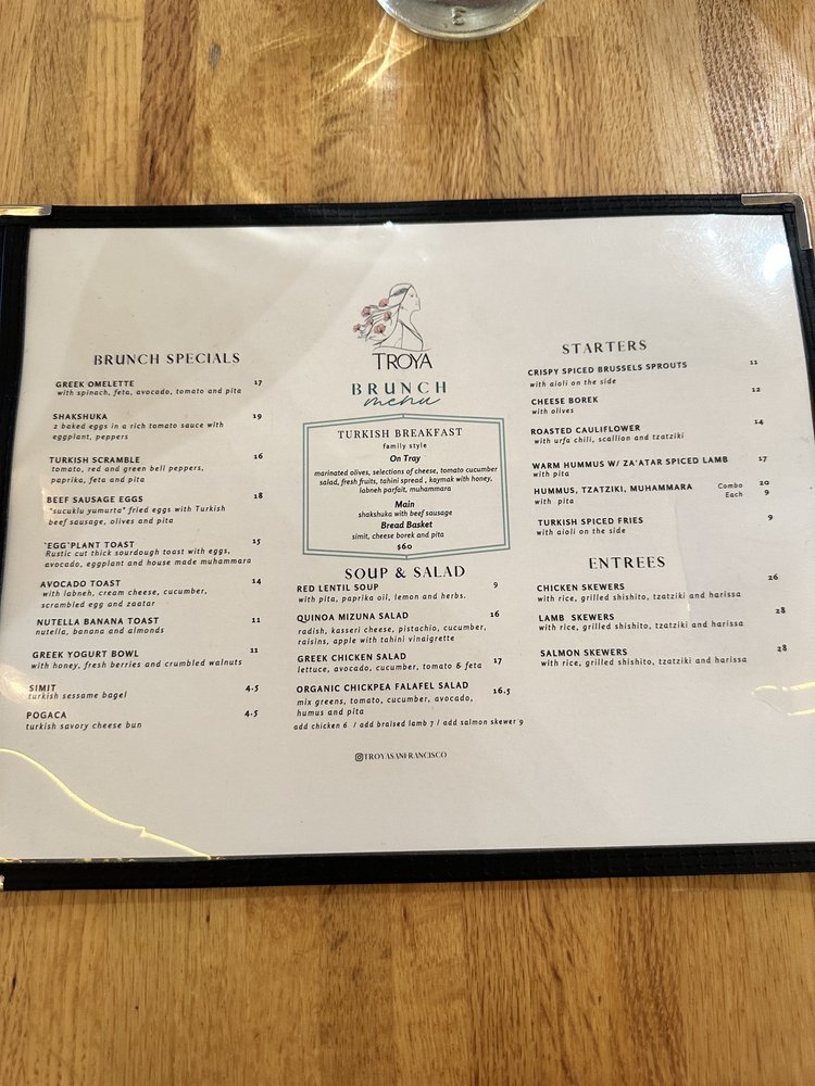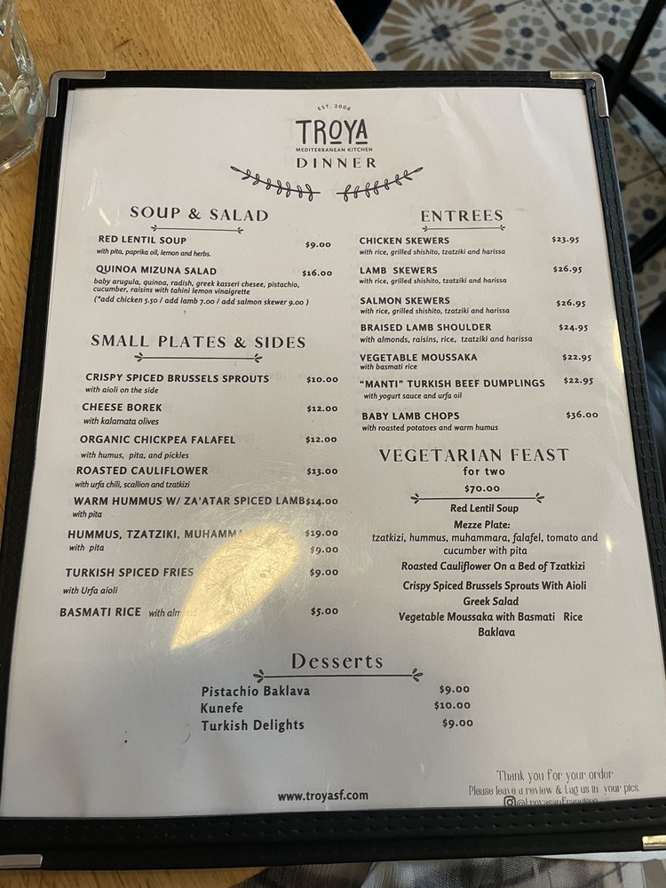 Troya, a Turkish-Mediterranean restaurant located in San Francisco, offers a diverse menu with vegan and vegetarian options. The restaurant provides a trendy atmosphere with outdoor seating and excellent service. Customer reviews highlight standout dishes such as the lamb skewers, cheese borek, and Manti Turkish dumplings. The flavors are rich and balanced, showcasing authentic Turkish cuisine. Notable mentions include the chicken kebab, lentil soup, and Turkish scramble, all bursting with robust flavors and generous portions. The restaurant also offers a variety of beverages including beer and wine. With welcoming staff and a vibrant ambiance, Troya provides a delightful dining experience that captures the essence of Turkish cuisine.