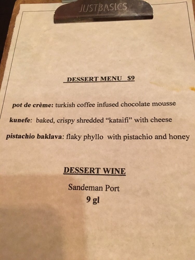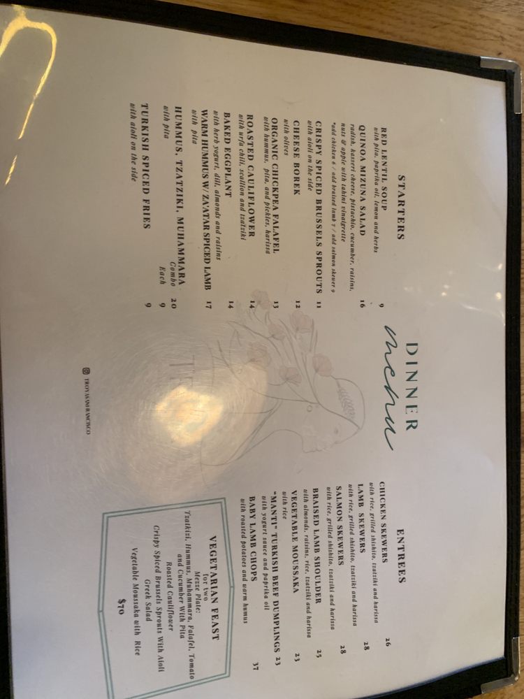 marinated olives, selection of cheese, tomato cucumber salad, fresh & dried fruits, tahini spread, kaymak with honey, labneh parfait, muhammara. Main dish of shakshuka with beef sausage, bread basaket with simit, cheese borek & pita.